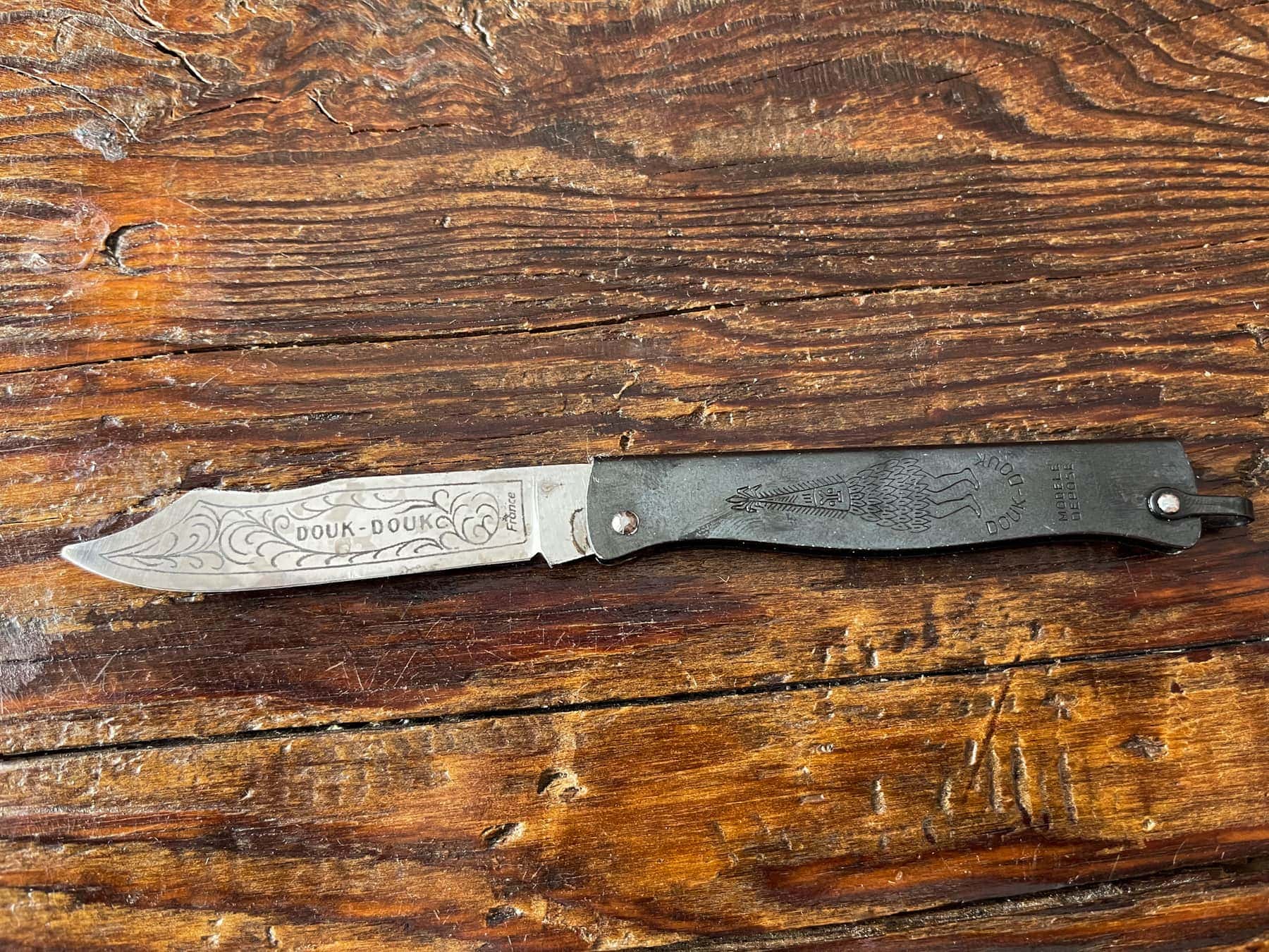 Douk-Douk est un dieu mélanésien. On le retrouve d’ailleurs gravé sur le manche. Ce couteau était initialement destiné au marché mélanésien mais a eu tellement de popularité qu’il a fait le tour du monde parce qu’il est plat et se dissimule parfaitement.