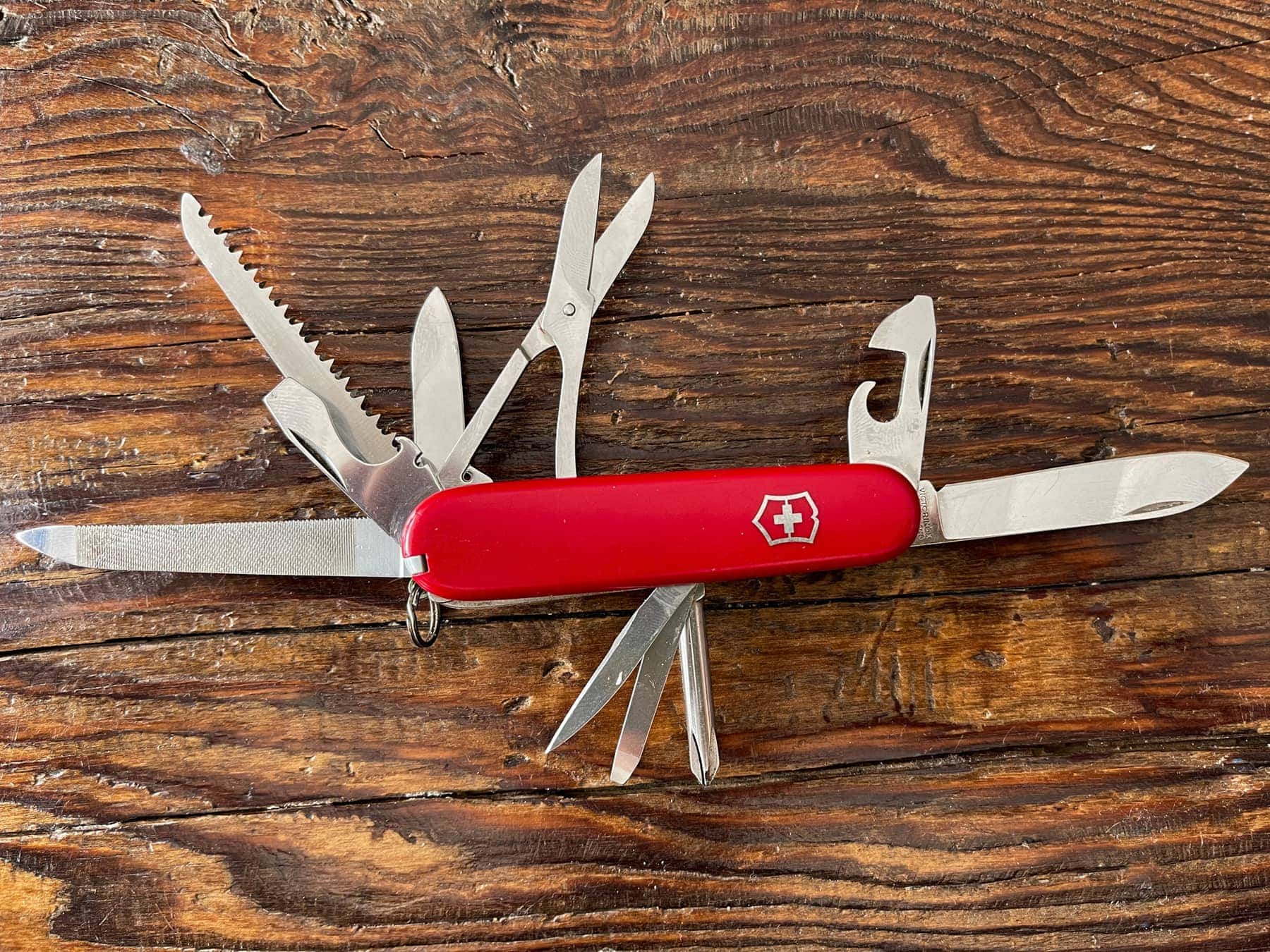 Mon couteau suisse est mon plus vieux couteau. Je l’ai dans ma trousse de toilette en permanence et je m’en sert quasi quotidiennement. Il manque le cure dent en plastique et le ressort dans les ciseaux est cassé. Il est presque aussi coupant que le premier jour que je l’ai eu! Mon modèle a 12 accessoires. Je ne peux plus compter le nombre de fois que je me suis coupé avec ce couteau!