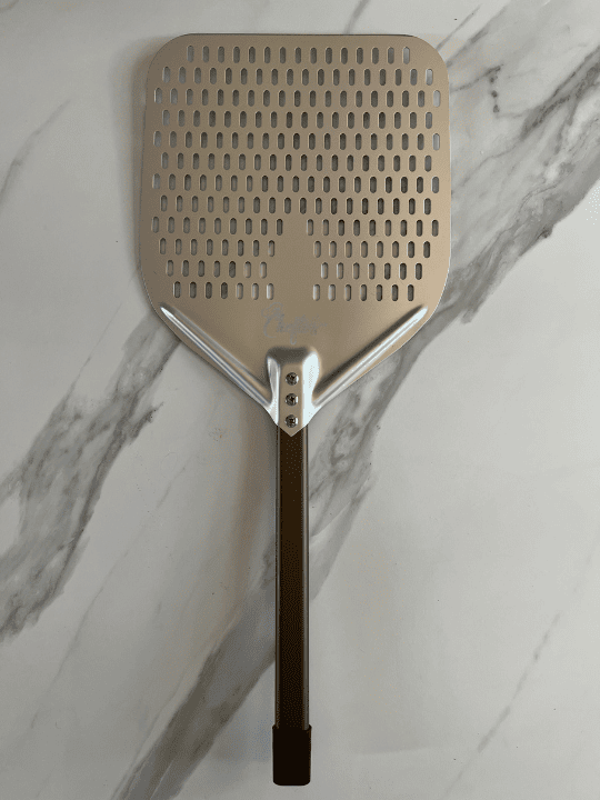 La pelle à pizza en métal trouée, comme l’image du haut, est parfaite car les trous permettent d’évacuer l’excédent de farine au lieu de l’accumuler sur les pierres chaudes de votre four à pizza pendant la cuisson. La farine brûlent et peut s’accumuler dans votre four à pizza ce qui demande un nettoyage constant.