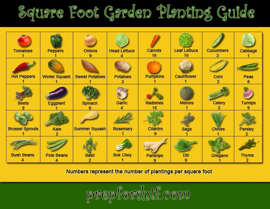De plus, voici un guide visuel des quantités de plants ou semences qui peuvent entrer dans chaque pied carré (très utile et vous verrez facilement la quantité impressionnante de légumes qui peut entrer dans un petit espace urbain).