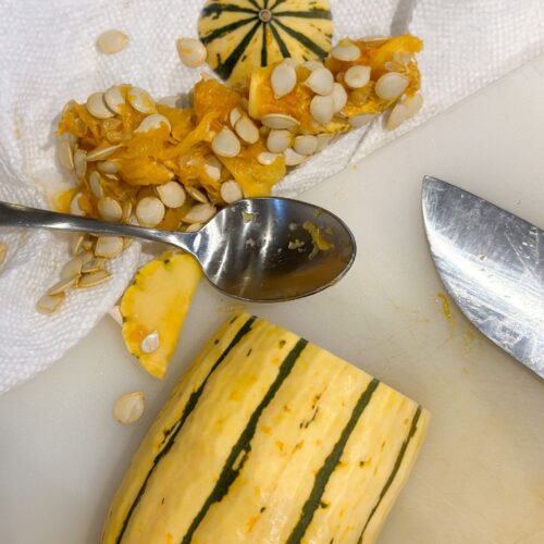 - Couper la courge sur la moitié longue et retirer les graines. Couper la courge delicata ou votre courge au choix en rondelles d'environ 1.5 -2 mm d'épaisseur.