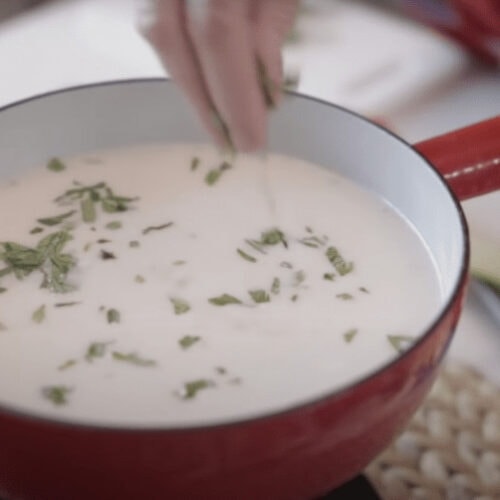 - Si vous le désirez, passer le bouillon au tamis (c’est facultatif) et transférer dans votre caquelon à fondue. Ajouter la coriandre hachée.
