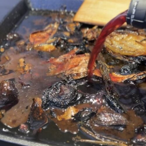 - Pendant ce temps, déglacer la poêle ou la rôtissoire avec le vin rouge. Laisser réduire un peu puis ajouter le bouillon de boeuf, amener à ébullition puis réduire le feu et laisser mijoter 15 minutes.