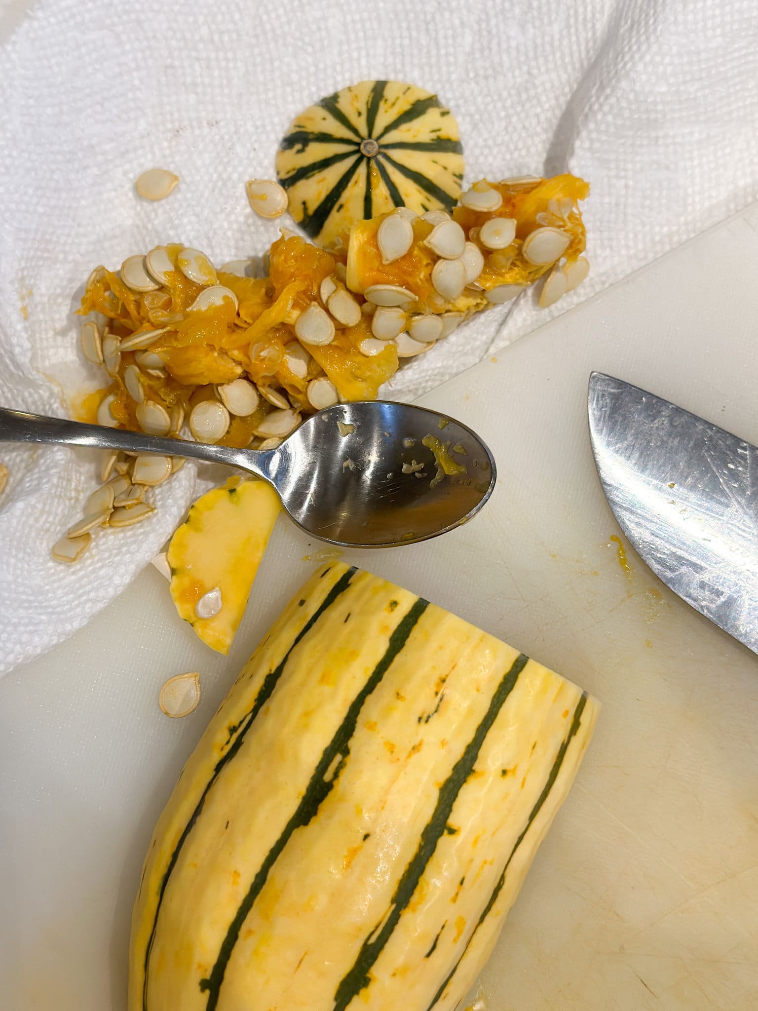 Couper la courge sur la moitié longue et retirer les graines. Couper la courge delicata ou votre courge au choix en rondelles d'environ 1.5 -2 mm d'épaisseur.