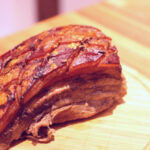 Servir le porc tendre et juteux avec sa couenne croustillante accompagné de son jus de cuisson.