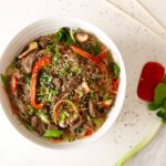 Couper les légumes (poivron, carotte, oignons verts, chou ou autre) et les faire sauter au wok pour 1-2 minutes. Les retirer du wok et mettre de côté. Ajouter la protéine, les champignons et l'ail mariné ainsi que la marinade au wok chaud et faire sauter rapidement. Remettre les légumes, ajouter les nouilles et puis verser 15ml (1c. à table) de sauce soya, 15ml (1c. à table) d'huile de sésame et 15g (1 c. à table) de sucre. Bien combiner. Garnir d'oignons verts et de graines de sésame (facultatives) et servir immédiatement.