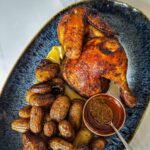 Quand le haut de cuisse est cuit (plus de 165 F ou 74 C), transférer le demi poulet dans une grande assiette de service, avec les petites patates divines et la sauce piri. Bom apetite!