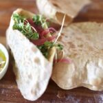 Soulever délicatement le disque de pâte et le déposer rapidement sur votre plaque au four. Après 2 minutes, une belle pochette devrait s'être formée. Retourner pour 1 minute, puis sortir et emballer dans un linge. Répéter avec toutes les petites boules de pâte.