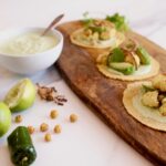 Sur chaque tortilla, étendre une cuillérée de sauce, ajouter le chou-fleur, garnir de pois chiches et oignons frits, quelques feuilles de coriandre et sauce épicée si vous le désirez.